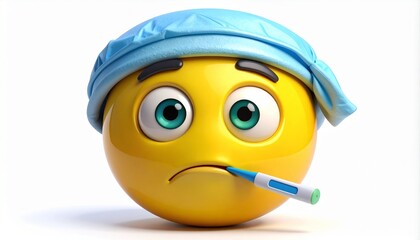 A 3D illustration of a sick emoticon character with a thermometer in its mouth and a blue cap, representing illness and fever.