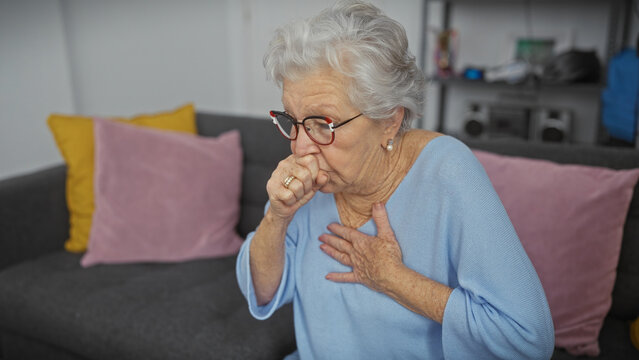 Elderly woman coughing while sitting on a sofa in a living room, expressing discomfort or illness.