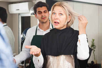 Furious mature woman screaming on hairdresser as hair cut badly