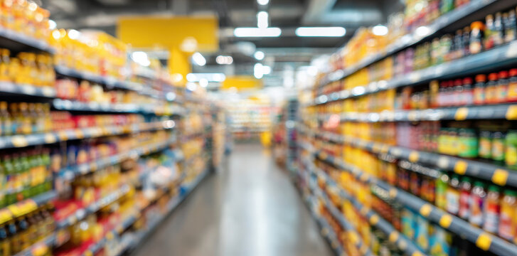 Blurred supermarket aisle with colorful products on shelves, creating an abstract background.