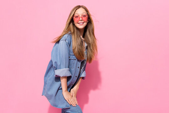 Full length photo of charming cute girl jump run for bargains on her holiday wear pink topcoat denim jeans isolated over blue background