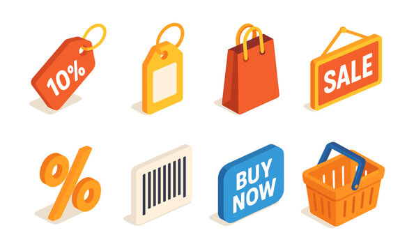 Isometric shopping icons: sale, discount, basket, tags, barcode, percent symbols