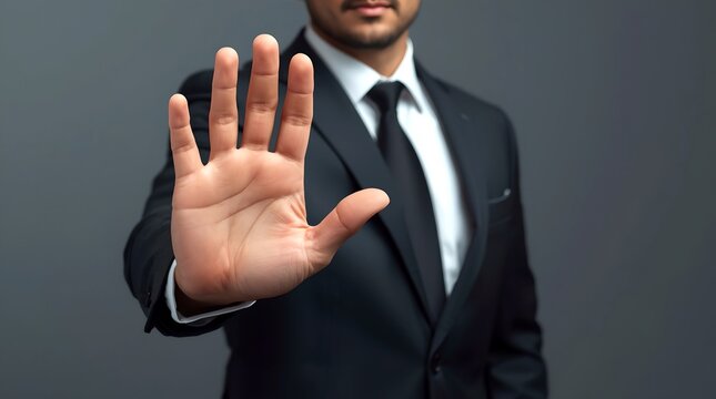 A man in a suit extends his hand in a stop gesture