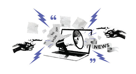 Conceptual illustration of online disinformation and media conflict, with a laptop, megaphone, and weapons.