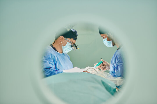 Through round window of unrecognizable doctors in uniforms and masks performing surgery in modern operating room