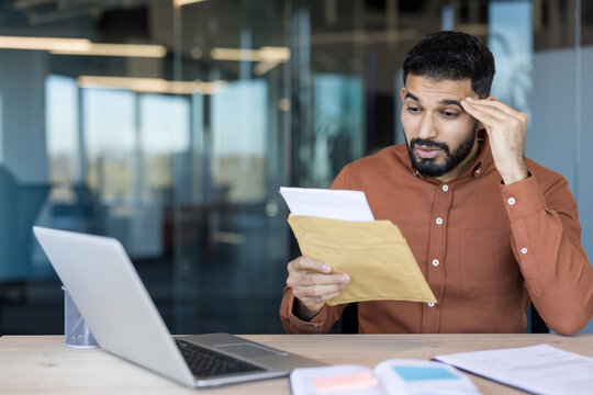 Stressed young man discovering shocking information in a letter, feeling worried and surprised while sitting at his desk in a modern office environment
