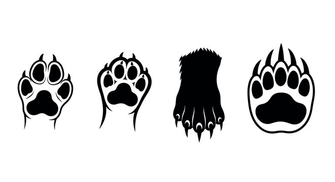 Black silhouettes of four distinct animal paw prints, featuring felines and canines in various styles for identification and design purposes.