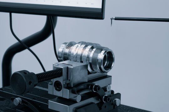 coordinate measuring machine in metal cutting industry. probe measure detail, operator inspection cam of camshaft by cam profile testing machine. industry metal processing concept blue tone background