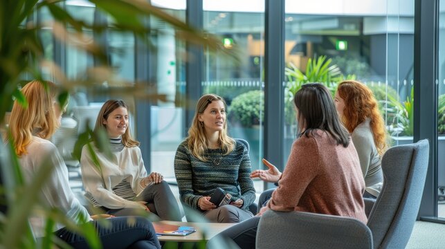 Group psychotherapy. Persons sitting in circle and talking. People meeting. Psychotherapy training, business lecture or conference. Man woman support group. Vector illustration.