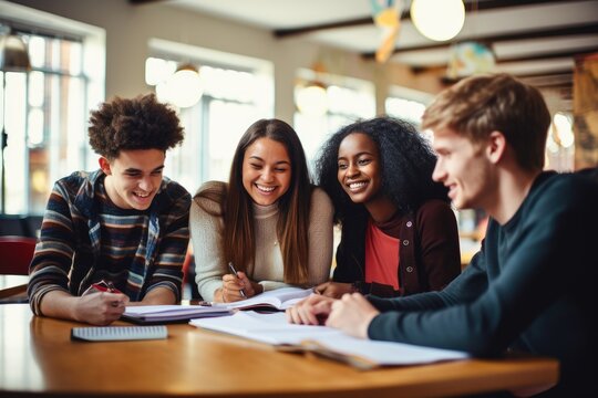 A diverse group of young individuals gathered around a table, actively participating in discussions and social interactions, group of students talking and writing at school, AI Generated