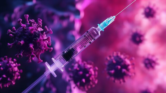 syringe filled with liquid and surrounded by purple colored virus cells, vaccination concept