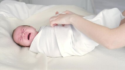Dissatisfied, crying, upset, sad Newborn baby boy lying in nursery in crib with blue clothes on bed in bedroom at home, child hungry or want to sleep, mother swaddling her baby after diaper change