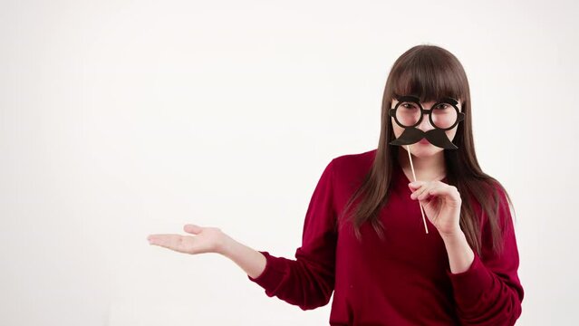 Caucasian brunette woman with bangs wearing red sweater holding paper glasses with mustache disguise in front of her face. Horizontal video. Isolated copy space. High quality 4k footage