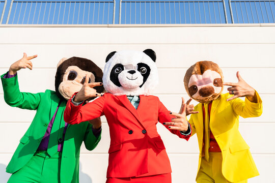 Women gesturing with men wearing animal masks in front of wall