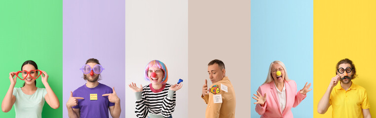 Set of funny people in disguise on color background. April Fools' Day