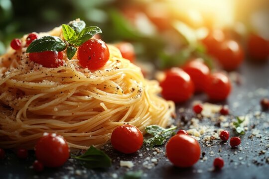 A festive dish featuring sturgeon in a baking dish topped with cherry tomatoes lemon olives and herbs with a lovely presentation and copy space image