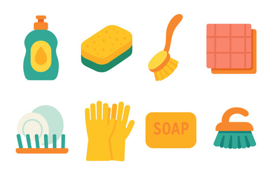 Cleaning tools flat icon set. featuring soap, sponge, scrub brush, towel, dish rack, gloves, bubble, mop