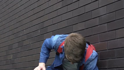 Multiracial students threatening depressed nerd boy in glasses showing dishonor
