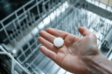 Holding a dishwasher tablet near an open dishwasher