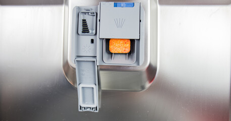dishwasher dispenser for cleaning grease and stains with water and chemical eco friendly packaged pod. detergent capsule pill for cleaning