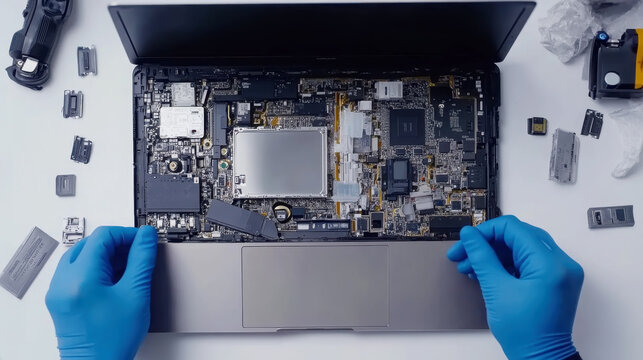 Detailed view of technician dismantling laptop for repair and maintenance