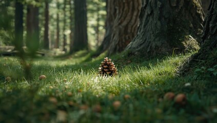 Pine cone resting on forest floor beneath tall fir trees, highlighting seed dispersal mechanisms