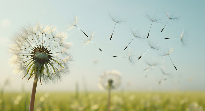 Serene dandelion seed dispersal scene with ethereal fluff drifting on the breeze