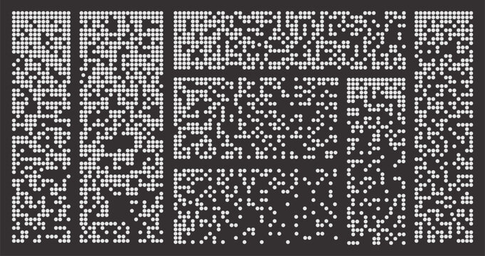Pixel disintegration collection. Dispersed dotted pattern. Flat halftone mosaic textures . Black and white dispersed elements vector illustration.