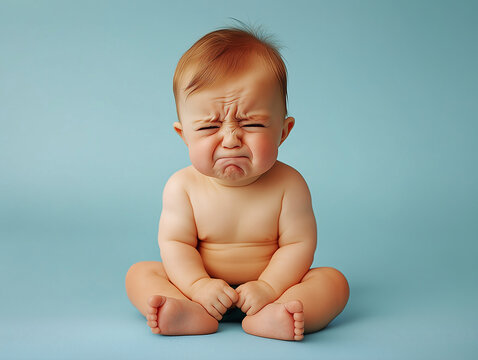 A distressed baby sitting on a blue background, showing emotions while experiencing displeasure during a playful moment