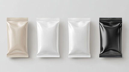 Blank white, black plastic, foil or polythene sachets for wet wipes, sauce or seasonings, shampoo samples isolated, 3d realistic vector illustration set. Food, cosmetics product packaging template