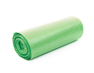 Black roll of plastic garbage bags isolated on white background