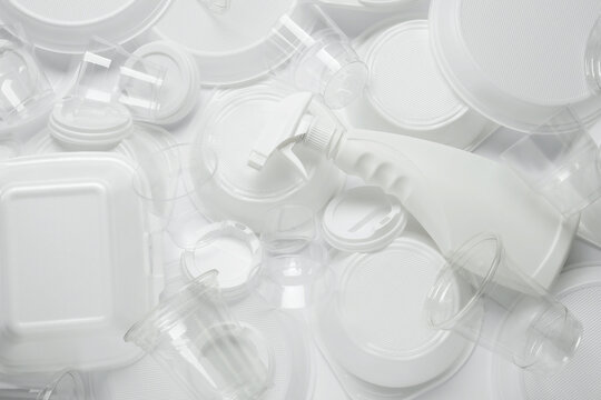 Different white plastic items as background, closeup