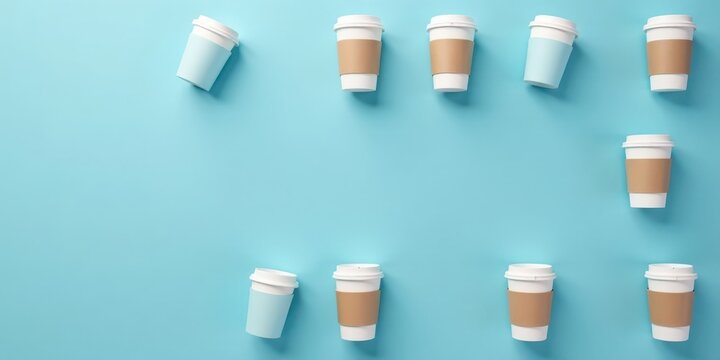 Three black coffee cups with kraft paper sleeves and a small plant in the center