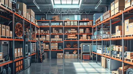 Warehouse with high shelves and sorted inventory, high detail