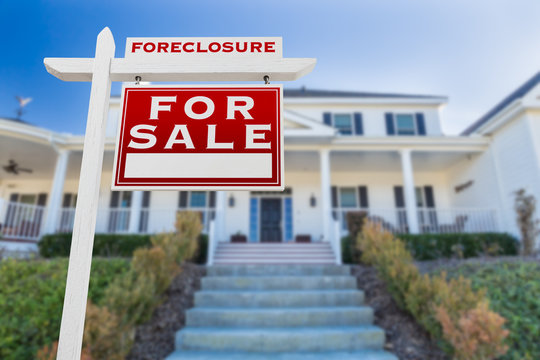 Right Facing Foreclosure For Sale Real Estate Sign in Front of House.