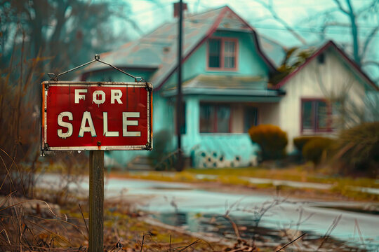 A distressed family home, ready for a quick sale For sale sign visible Perfect for real estate, foreclosure, or economic hardship imagery , bankruptcy, housing crisis