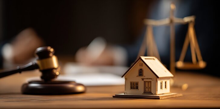 Real Estate Law Concept: Gavel, Model Home, and Scales of Justice on Wooden Surface