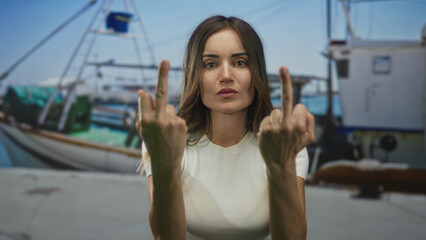 Woman raises her middle fingers toward the camera by a sunlit fishing boat at a busy street pier; defiance.