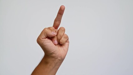 Man showing middle finger gesture with hand against neutral background expressing offensive or disrespectful emotion