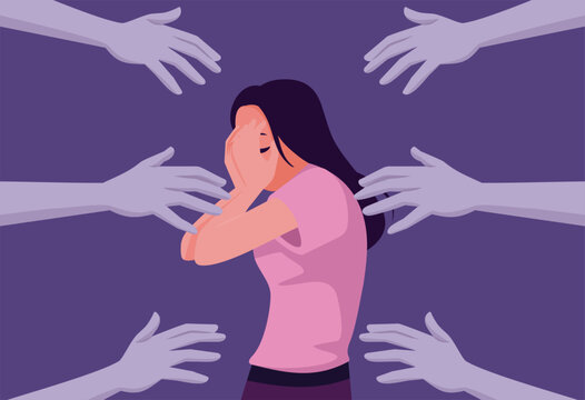 Unhappy Female Victim Being Harassed Vector Concept Illustration. Girl feeling hurt by disrespectful touching from stranger men