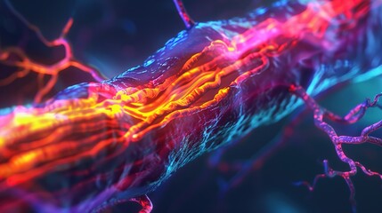 Arteries with fatty streaks glow under UV light. Surreal colors. Macro view.