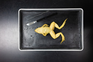 Long grey desk with microscope, scalpel, tweezers, paper with sketch of animal internal structure and plastic tray with frog for dissection