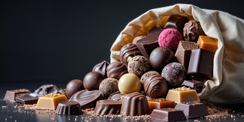 A Beautifully Overflowing Bag of Chocolate Treats Featuring Various Chocolate Types Perfect for Gifts or Celebrations on a Dark Background.