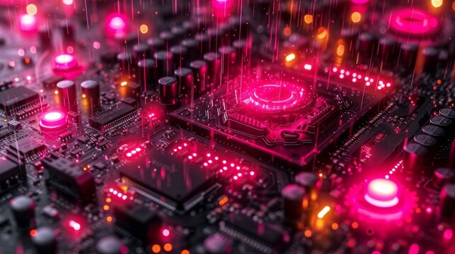A circuit board with a glowing CPU