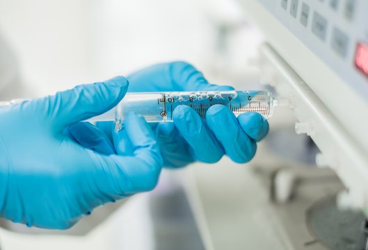 Analyst is Drawing sample from dissolution test of semi automatic type tester and wear the safety protective gloves.