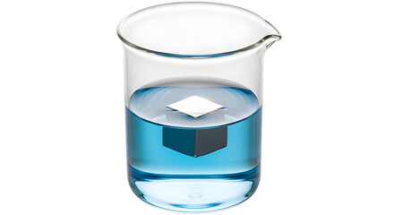 A clear glass beaker containing a blue liquid and a white cube