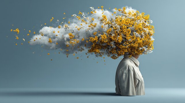 Mind Bloom: A surreal image of a person's head dissolving into a cloud of blossoms, embodying creativity, thought and idea generation.