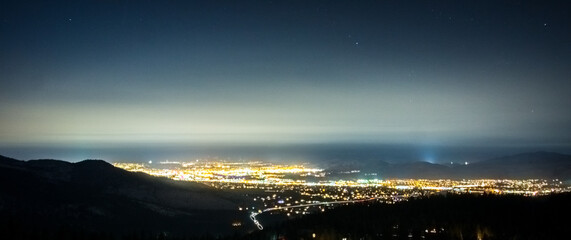 Drone shot Yerevan in night time. Drone view Mother Armenia statue in Victory Park in evening time.  High angle view of illuminated buildings in city at night, Yerevan, Armenia, West Asia.