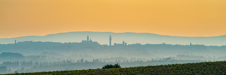 Italy, Tuscany, Siena, Panoramic view of hills and distant city at foggy dawn