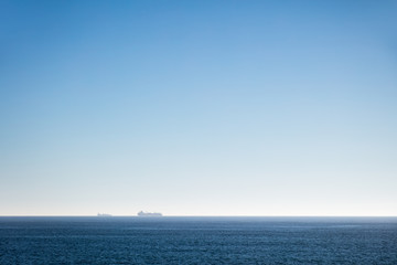 Distant cargo ships on the ocean horizon